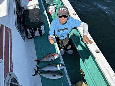 アジ 0~7尾 18~34cm カンパチ 0~2尾 27~38cm マダイ、ハナダイ、メジナ、ウマヅラ、サバ他
