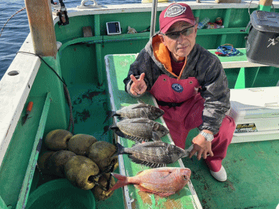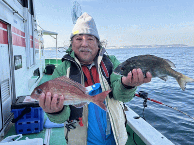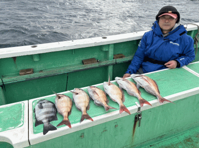 佐島・志平丸 マダイ船 1月17日 マダイ 0~2枚 0.4~1.7kg クロダイ 0~2尾 1.4~1.6kg サバ