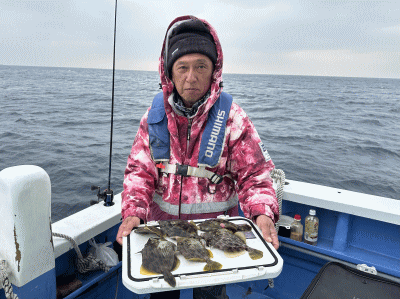 佐島・志平丸 ヒラメ船 2月19日 ヒラメ 0~2枚(2人) 0.6~1.8kg ワラサ