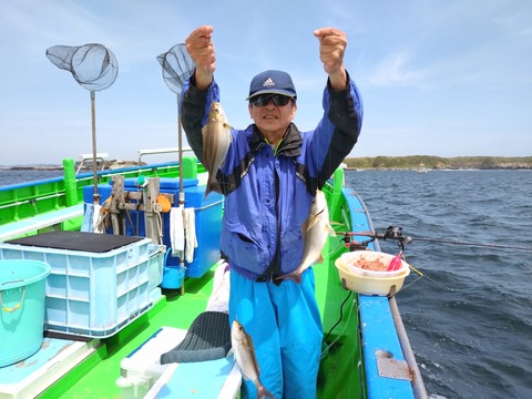 佐島・海楽園 LT五目仕立船 4月18日 イサキ3点掛け・好調維持です。良型メジナも
