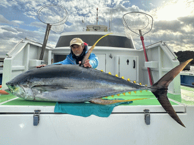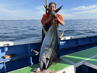 朝から中々船に付かず苦戦、反応が入ってきたタイミングでキハダがHIT!見事60㎏級のモンスターGET